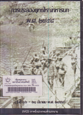 หมายเหตุ  เป็น SVCD สารคดีภาพนิ่ง ประกอบคำบรรยาย ว่าด้วยเหตุการณ์การซ้อมรบ หรือประลองยุทธ์ครั้งใหญ่ ในตอนต้นรัชกาลที่ 6 ซึ่งเริ่มต้นตั้งแต่ วันเสาร์ที่ 11 มีนาคม พ.ศ. 2458 การซ้อมรบคราวนี้ พระบาทสมเด็จพระมงกุฏเกล้าฯ ทรงพระราชดำเนินไปทอดพระเนตรด้วย นับเป็นการตรวจสอบความพรักพร้อม ความสามัคคี และการแสดงความจงรักภักดีครั้งสำคัญในตอนต้นรัชกาลนี้ ในแผ่นมีภาพการซ้อมรบอย่างละเอียด ถี่ถ้วน เป็นภาพขาว-ดำ ไล่ลำดับเหตุการณ์ โดยแบ่งเป็น 3 ฝ่าย คือ ฝ่ายบัญชาการการซ้อมรบ ฝ่ายขาว และฝ่ายแดง ภาพชุดนี้ให้ทั้งความเพลิดเพลิน และความรู้ทางการทหารในสมัยนั้นอย่างสมบูรณ์ ท่านจะเห็นการรบในรูปแบบต่าง ๆ การวางกำลัง การตั้งรับ การเข้าปะทะในรูปแบบต่าง ๆ รวมทั้งอาวุธยุทธปกรณ์ที่เรามีใช้ในยุคนั้น จึงนับเป็นเอกสารที่อยู่ในขั้นปฐมภูมิสำหรับผู้ศึกษาด้านการทหาร การถ่ายภาพ การออกแบบการแต่งกาย และนักรัฐประศาสนศาตร์ * เป็น SVCD สารคดีภาพนิ่ง ประกอบคำบรรยาย